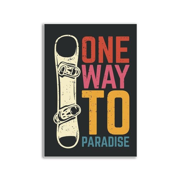 Dieses lebendige Poster zeigt ein auffälliges Snowboard-Design mit fettem, buntem Text mit der Aufschrift 'One Way to Paradise'. Perfekt für jedes Zimmer, das einen Hauch von Abenteuer und Stil braucht.