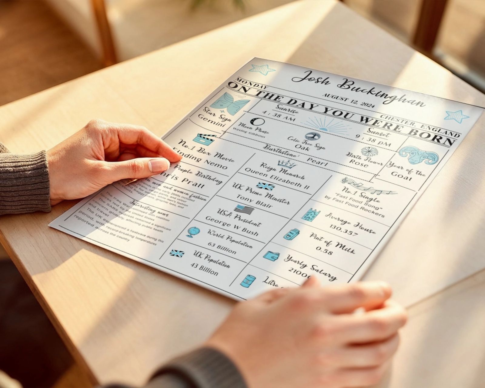 Jedes Poster wird auf Bestellung angefertigt und mit Sorgfalt gedruckt, um ein hochwertiges Finish zu gewährleisten, das in jedem Zuhause wunderschön aussieht. Ein personalisiertes Geburtsposter ist mehr als nur Dekor - es ist ein Andenken, das den Tag bewahrt, an dem Ihre Geschichte begann.